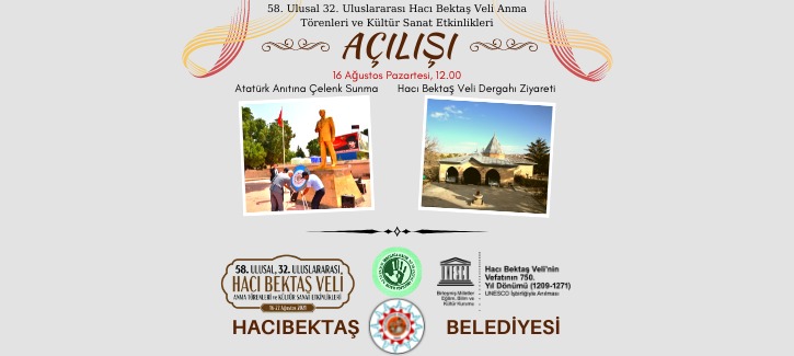 58.Ulusal 32. Uluslararası Hacı Bektaş Veli Anma Törenleri ve Kültür Sanat Etkinlikleri bugün saat 12.00’de Atatürk Anıtına çelenk sunma ve Hacı Bektaş Veli Dergahı ziyareti ile başlıyor. Kent Meydanındaki açılış programımıza tüm halkımız davetlidir.