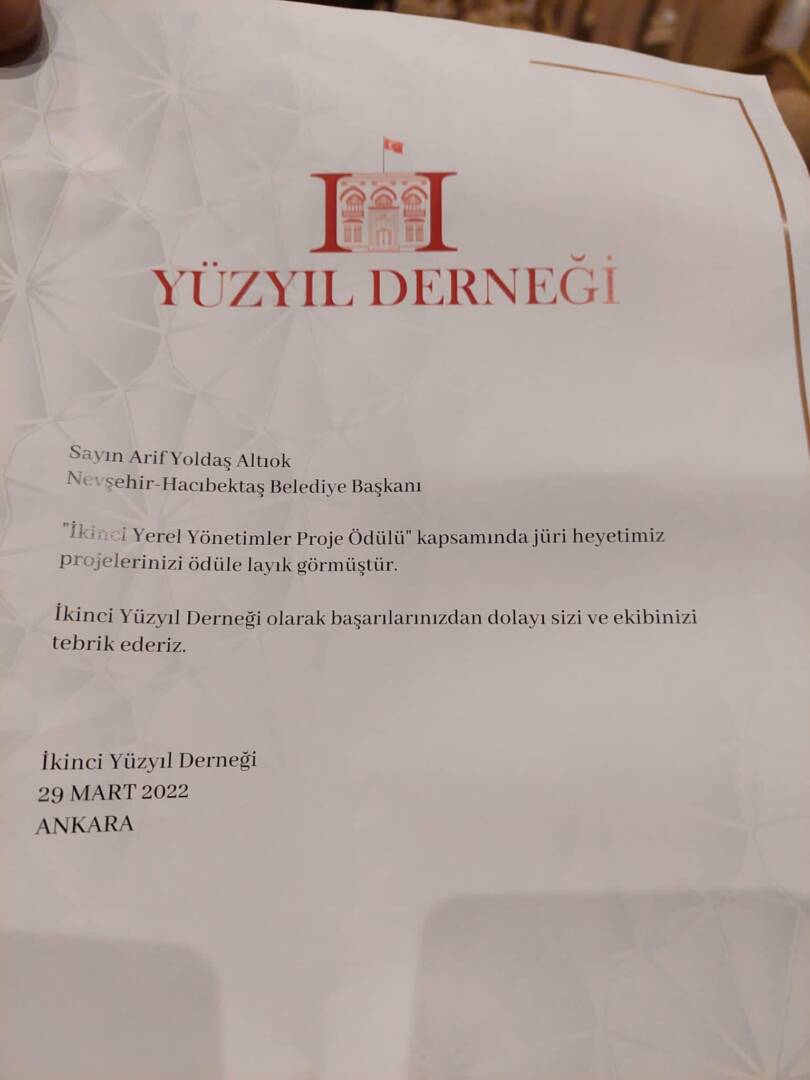 Genel Başkanımız Sayın Kemal Kılıçdaroğlu’nun katılımlarıyla, İkinci Yüzyıl Derneği tarafından verilen “ Yerel Yönetimler Proje Ödülleri “ Ödülüne Hacıbektaş Belediye Başkanı olarak seçilmenin mutluluğu içerisindeyim.Ödülümüzü Gazeteci Özlem Gürses’in elinden benim adıma Atlas Yardım Derneği Başkanımız Ferda Altıntaş almıştır. Yeni projelerimizi hayata geçirmek için var gücümüzle çalışmaya devam edeceğiz.