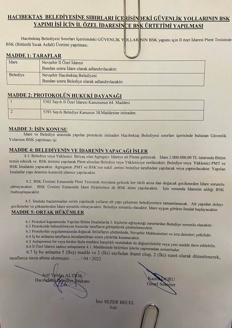 İçişleri Bakanlığımız tarafından Hacıbektaş’ımızda Asfalt serimi için gönderilen 2.000.000 tl bütçe dolayısıyla Nevşehir il özel idaresi ile 5.000 ton Asfalt protokolünü İl Özel İdaresi Genel Sekreterimiz Kamil Duru ile imzaladık.
